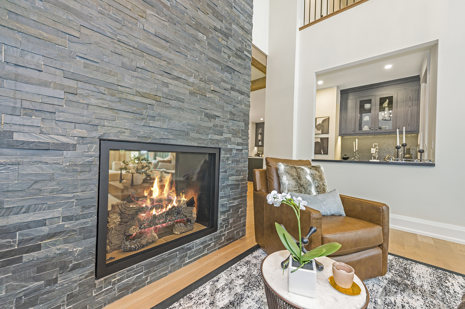 To create visual continuity throughout the main areas of your home, repeat materials in clever ways to link smaller spaces to your family room. For example, the stone used on the fireplace can be extended to an accent wall in the rec room or as a statement piece in the foyer. Alternatively, if you’ve chosen a porcelain slab for your fireplace, reuse it as a kitchen countertop or a powder room finish. Connecting materials across your home is a strategic way to achieve a cohesive, flowing aesthetic.